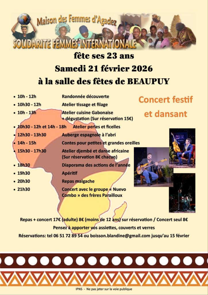 A 18h un diaporama des actions de l’année à Agadez, suivi d’un apéritif puis d’un repas malgache (17€ adultes 12€ enfants – de 12 ans) et d’un concert de musique festive.
