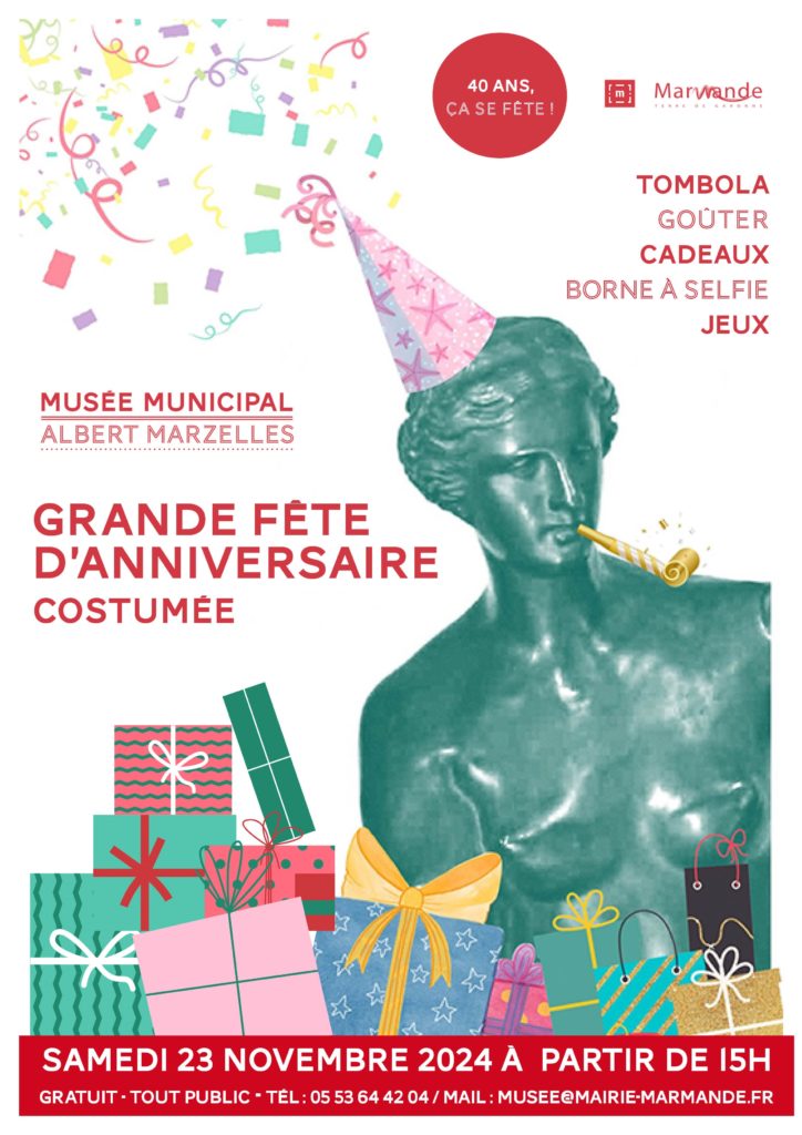 Le Musée Marzelles souffle ses 40 bougies. Les visiteurs sont invités à venir costumés s’ils le souhaitent à la manière de la IIIème République (période marquant la première collection d’œuvres et d’objets présentés à l’inauguration) ou à la façon « années 80 » en écho à l’année d’ouverture du musée.