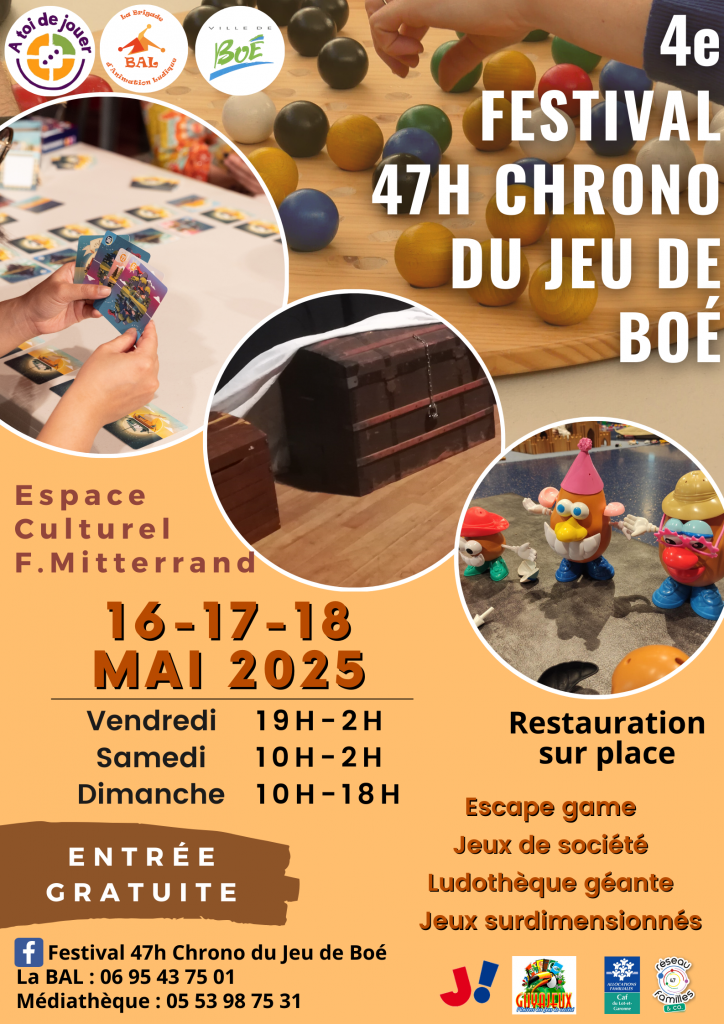 Du 16 au 18 mai 2025, la ville de Boé, la Brigade d’Animation Ludique et l’association “À Toi de Jouer”, s’associent pour vous proposer un événement ludique exceptionnel dans l’Agenais : 47 heures de jeu sur le week-end !