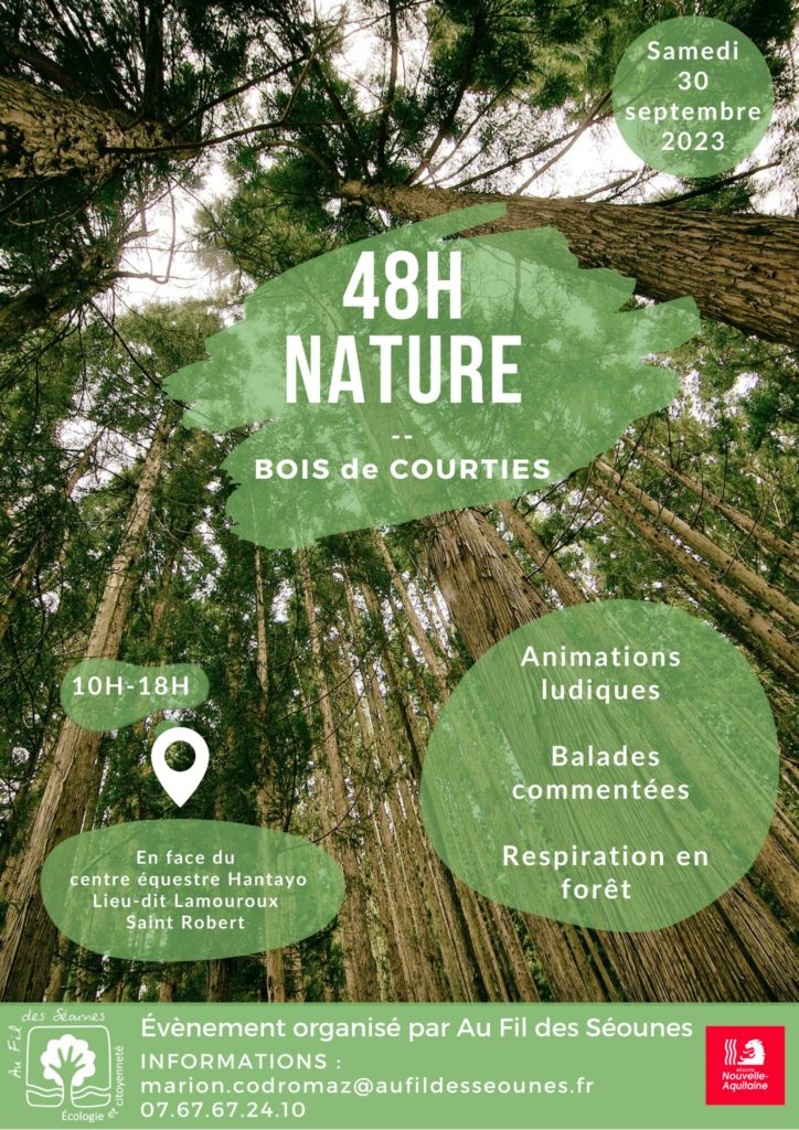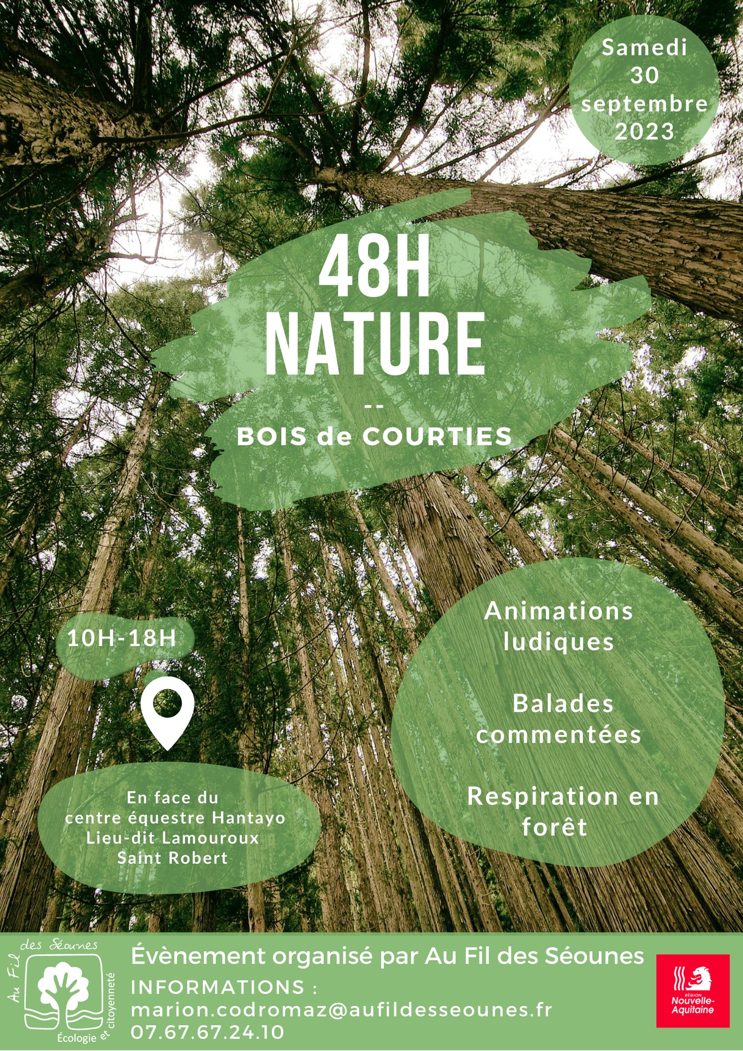Dans le cadre d’un évènement organisé par la Région Nouvelle Aquitaine : les 48H Nature, venez prendre un bol d’air au Bois de Courties, à Saint Robert, le samedi 30 Septembre de 10h à 18h avec l’association Au Fil des Séounes !