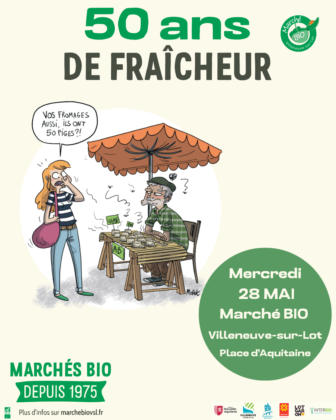 Le mercredi 28 mai 2025, le Marché Bio de Villeneuve-sur-Lot fête ses 50 ans. Premier marché 100 % biologique créé en France, il incarne depuis 1975 un rendez-vous emblématique en faveur de l’agriculture bio et des circuits courts.