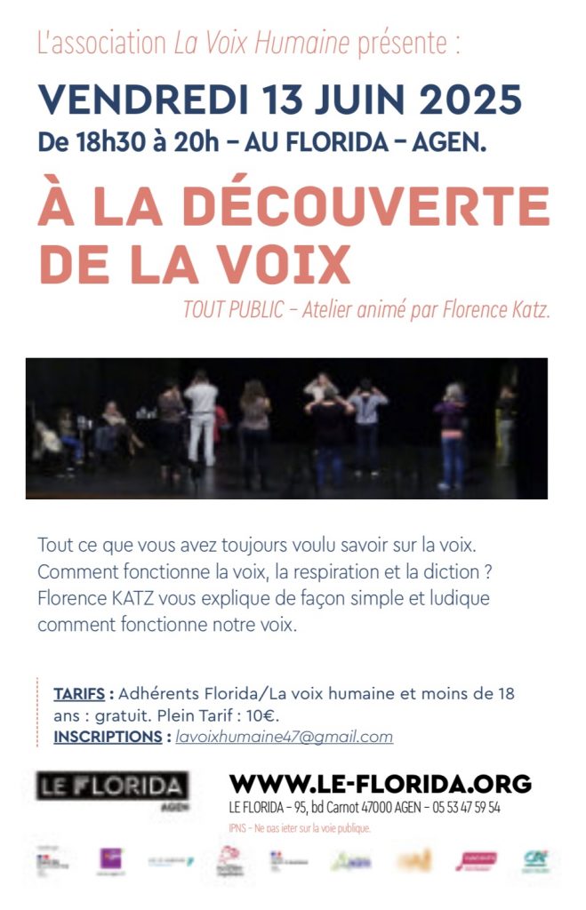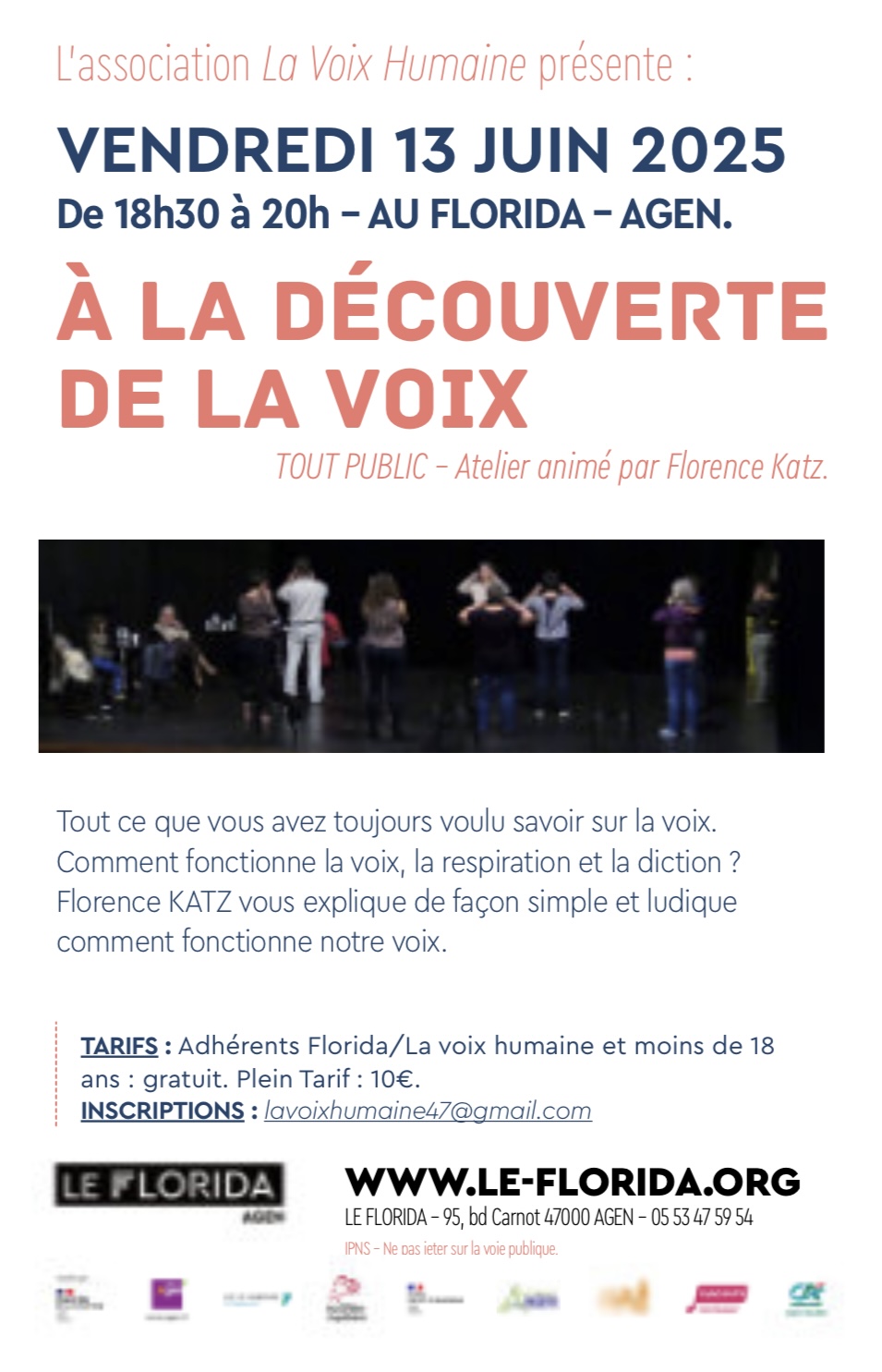 Il s’agit d’un atelier où Florence KATZ vous explique de façon simple comment fonctionne notre voix et vous apporte des moyens pour ne pas la forcer et se faire entendre.