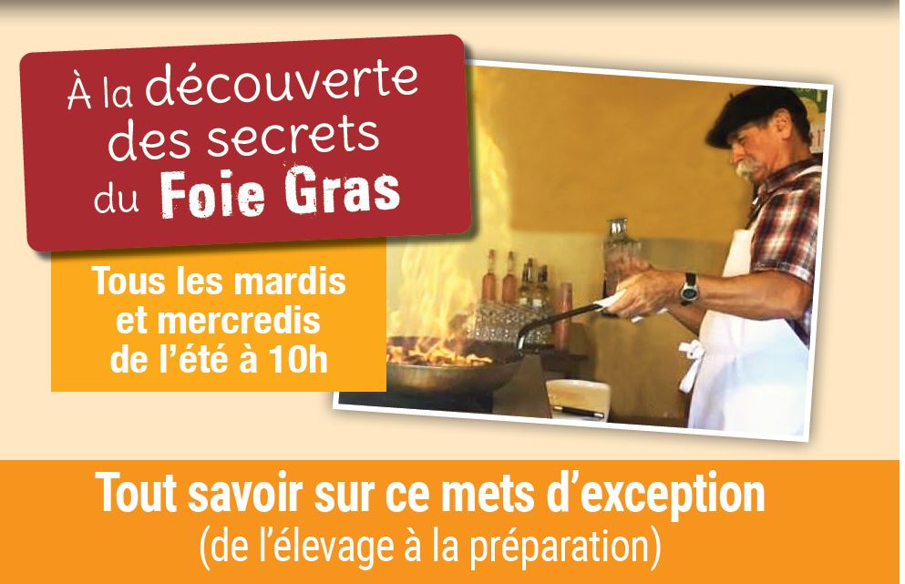 Démonstration de cuisine et dégustation où le foie gras poêlé aux fruits est préparé sous vos yeux. Vous dégusterez ensuite cette spécialité, accompagnée d’un verre de l’amitié, pour savourer pleinement les saveurs authentiques du terroir.