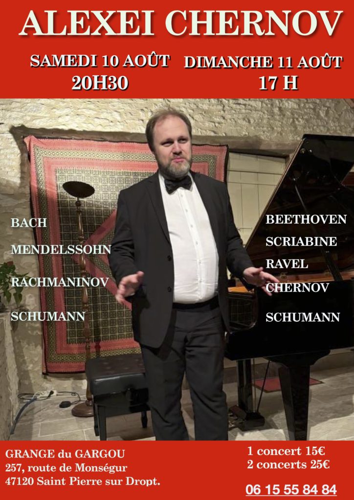 Les 10 (à 20h30) et 11 août (à 17h) à la grange du Gargou de Saint Pierre sur Dropt, Alexey Chernov se produira en récital avec deux programmes différents : de Bach à Silvestrov (célèbre compositeur ukrainien en passant par Schumann, Beethoven, la musique russe bien sûr , et en cadeau au public français le Scarbo de Ravel !