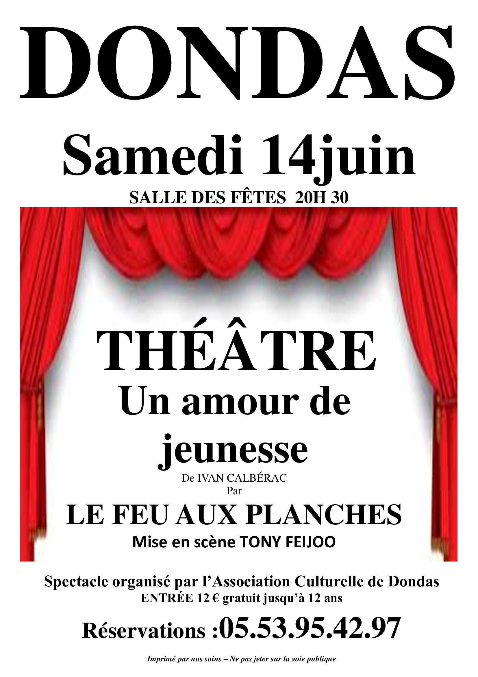 Venez nous rejoindre nombreux à partir de 20h30 dans la salle des fêtes de Dondas, les comédiens roquentins de la troupe « Le Feu aux Planches » y interpréteront la pièce de théâtre intitulée « Amour de Jeunesse ».