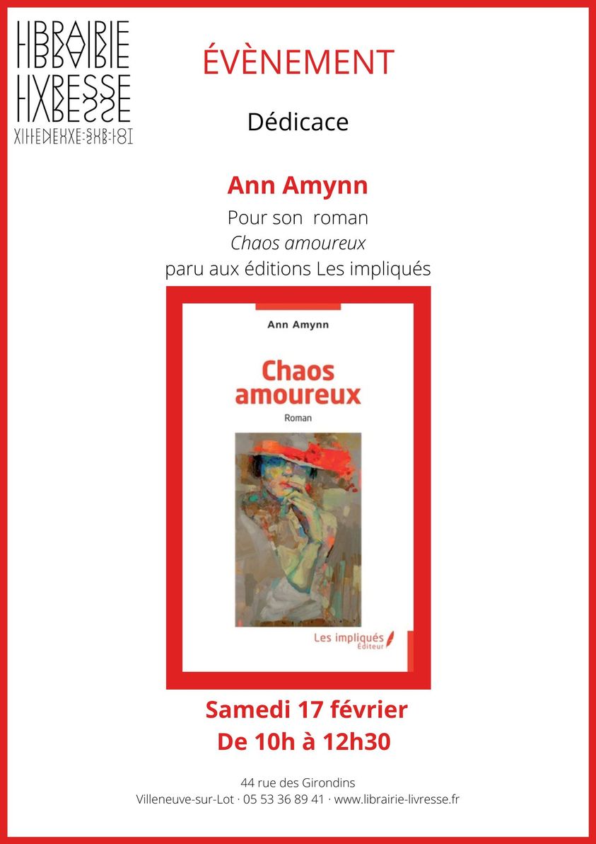 Samedi 17 février de 10h à 12h30, Ann Amynn viendra dédicacer son roman « Chaos amoureux », paru aux éditions Les Impliqués.