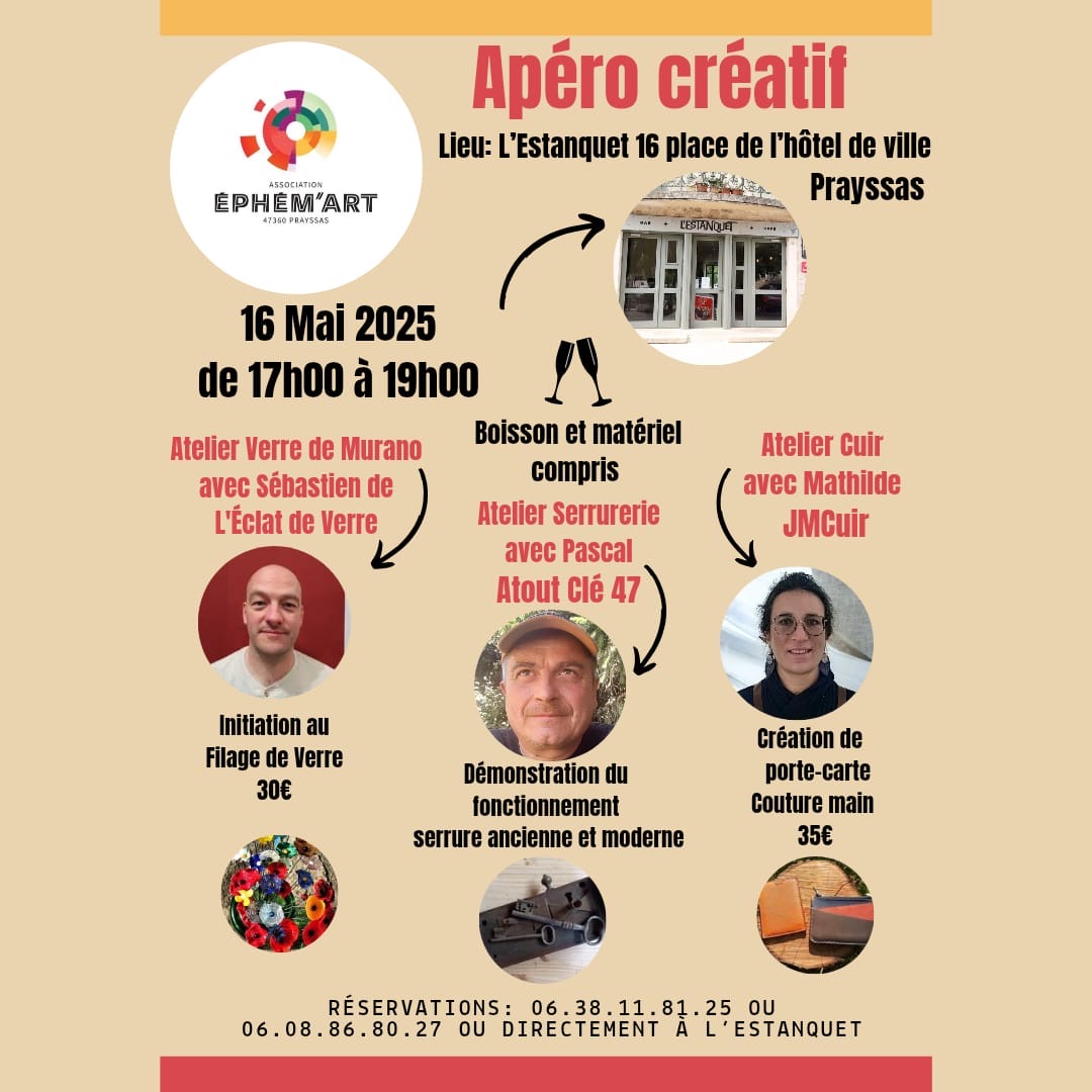 Apéro créatif avec 3 artisans au choix qui partagent leur savoir faire à Prayssas.