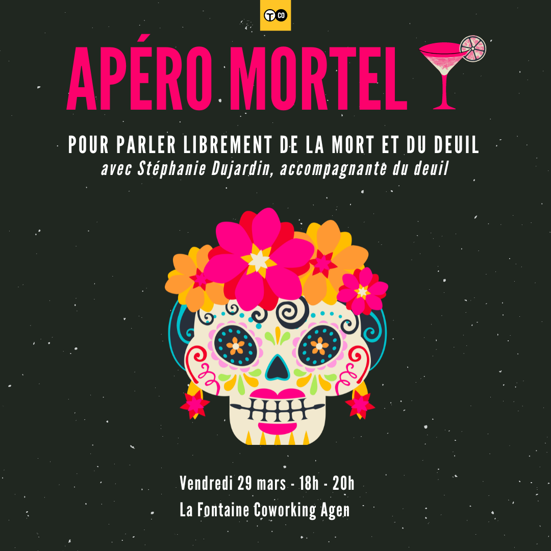 Premier « Apéro Mortel » à La Fontaine le vendredi 29 mars de 18h à 19h30.Un apéro mortel c’est quoi ?Un temps pour parler librement de la mort et du deuil dans un cadre de sécurité et d’écoute autour de ces sujets souvent tabous …