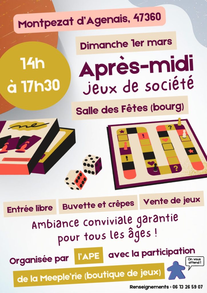 Après-midi jeux de société pour tous organisé par L’association des parents d’élèves de Montpezat et St-Sardos.