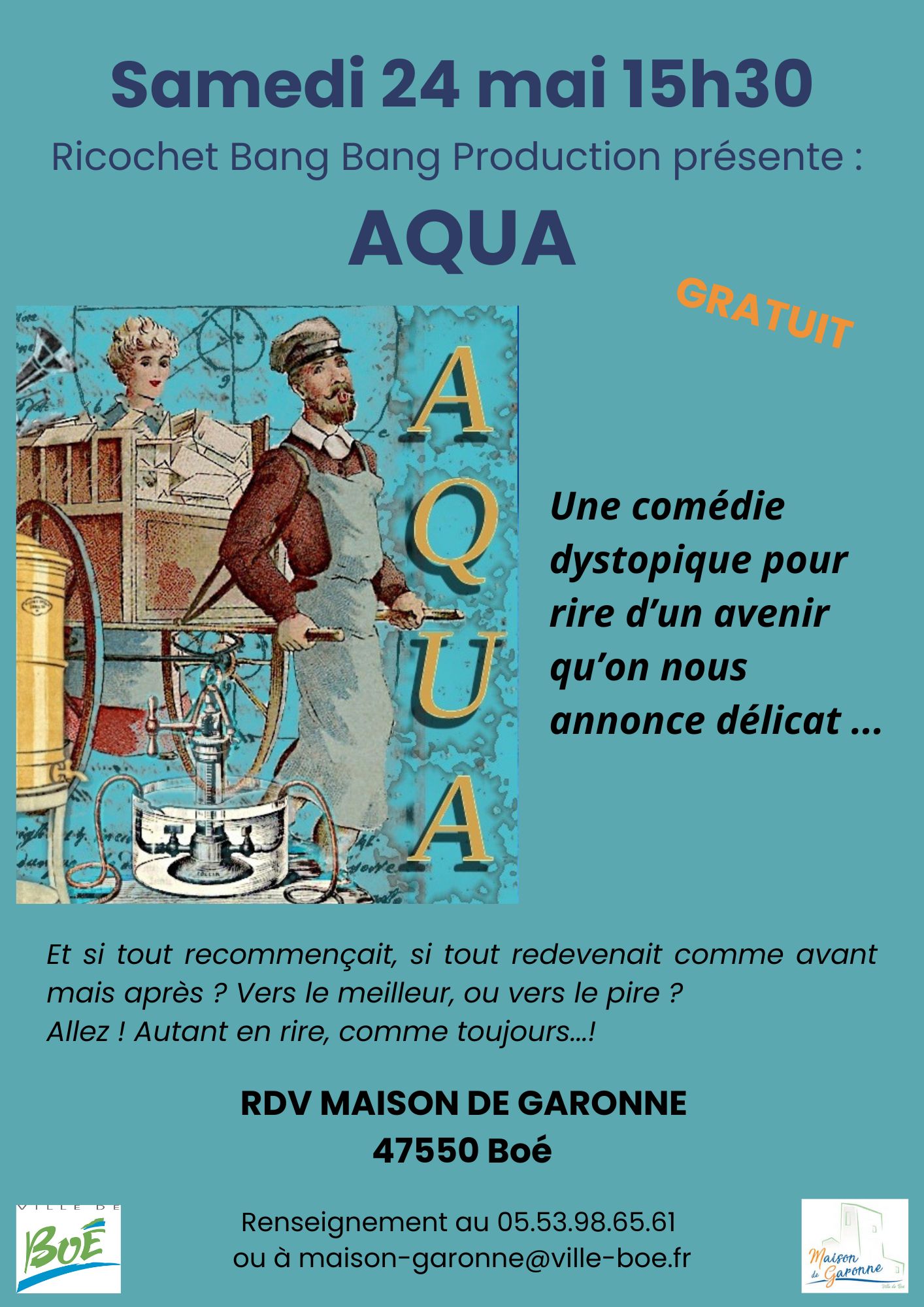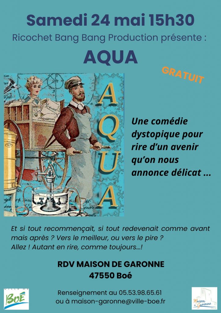 Vaudeville surréaliste sur fond de comédie dystopique? Aqua brouille les pistes et mélange les univers pour rire d’un avenir qu’on nous promet pour le moins délicat. La fin de l’abondance de ressources planétaires et l’empoisonnement de la plus précieuse de toutes, l’Eau, nous plonge dans le monde d’après toutes nos bêtises humaines, d’après le refus de la réalité. Un monde d’après, qui nous renverrait à un monde d’avant, plus simple, plus essentiel, moins confortable.