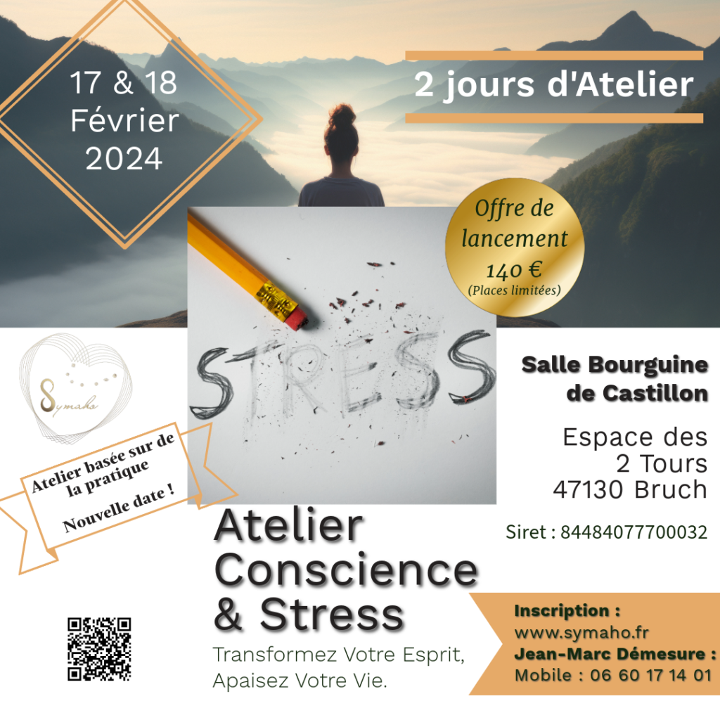 Rejoignez-nous les 17 et 18 Février 2024 pour un voyage transformateur au cœur de la gestion du stress. L’atelier « Conscience et Stress », animé par Jean-Marc Démesure, vous offre une opportunité unique d’apprendre des techniques douces pour apaiser votre quotidien. Dans un cadre chaleureux et studieux, cet atelier de deux jours à Bruch vous permettra d’harmoniser vos pensées et émotions, favorisant un bien-être profond et authentique.