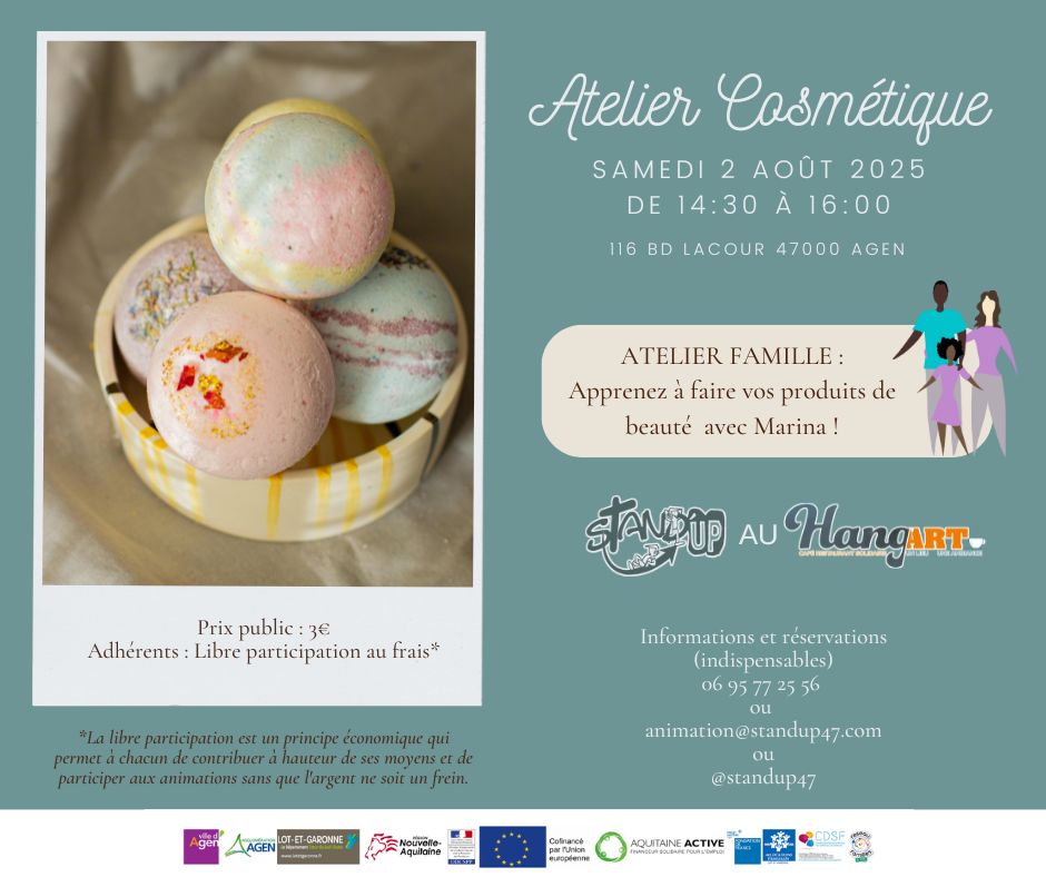 Loisirs Atelier cosmétique Le Hang'art - Agen 116 Boulevard Edouard Lacour 47000 Agen Voir tous les événements se déroulant ici le 2 août De 14h30 à 16h Familial 3€ Viens réaliser des bombes de bain avec Marina ! Stand'UP 06 95 77 25 56 animation@standup47.com