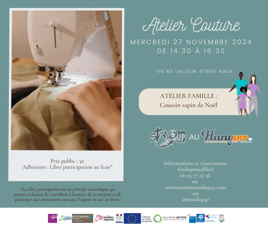 Loisirs Atelier couture Le Hang'art - Agen 116 Boulevard Edouard Lacour 47000 Agen Voir tous les événements se déroulant ici le 27 novembre 2024 De 14h30 à 16h30 3€ Création d’un coussin en forme de sapin de Noël. Stand'UP 06 95 77 25 56 animation@standup47.com