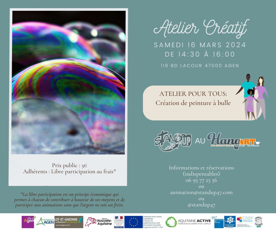 Loisirs Atelier Créatif Atelier en famille Le Hang'art - Agen 116 Boulevard Edouard Lacour Agen Voir tous les événements se déroulant ici le 16 mars 2024 De 14h30 à 16h Familial 3€ Création de peinture à bulle. Stand'UP 06 95 77 25 56 animation@standup47.com