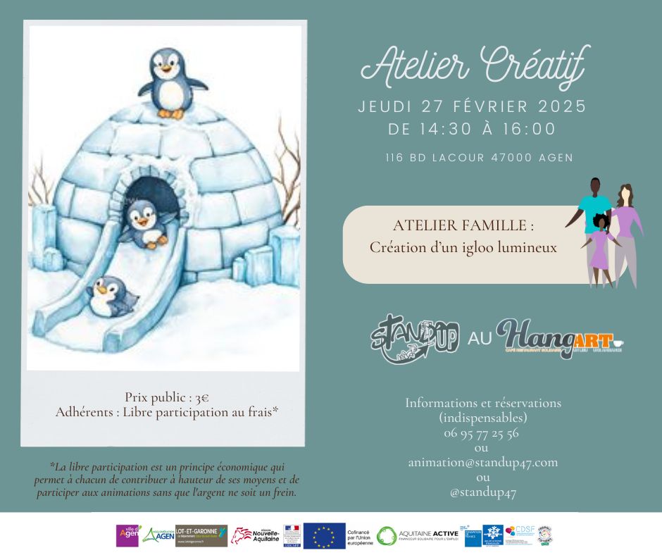 Loisirs Atelier Créatif Le Hang'art - Agen 116 Boulevard Edouard Lacour 47000 Agen Voir tous les événements se déroulant ici le 27 février De 14h30 à 16h 3€ Création d’un igloo lumineux. Stand'UP 06 95 77 25 56 animation@standup47.com