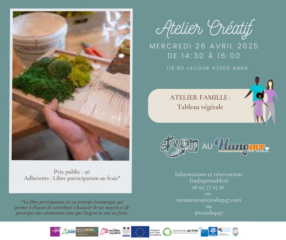 Loisirs Atelier Créatif Le Hang'art - Agen 116 Boulevard Edouard Lacour 47000 Agen Voir tous les événements se déroulant ici le 26 avril De 14h30 à 16h Familial 3€ Réalisation d’un tableau végétale avec Anaïs. Stand'UP 06 95 77 25 56 animation@standup47.com
