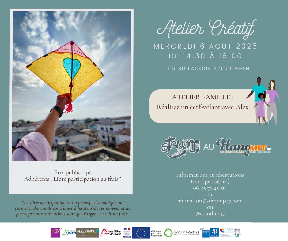 Loisirs Atelier Créatif Le Hang'art - Agen 116 Boulevard Edouard Lacour 47000 Agen Voir tous les événements se déroulant ici le 6 août De 14h30 à 16h Familial 3€ Venez réaliser un cerf volant avec Alex ! Stand'UP 06 95 77 25 56 animation@standup47.com