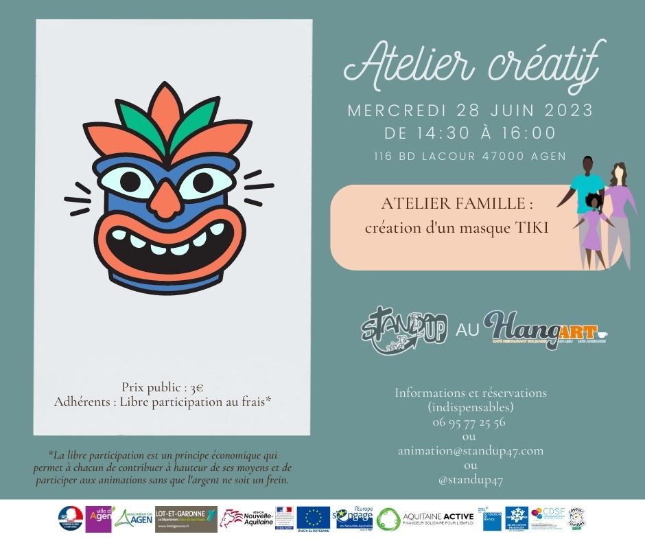 Loisirs Atelier Créatif Atelier en famille Le Hang'art - Agen 116 Boulevard Edouard Lacour Agen Voir tous les événements se déroulant ici le 28 juin 2023 De 14h30 à 16h Familial 3€ Création de masque TIKI ! Stand'UP 06 95 77 25 56 animation@standup47.com