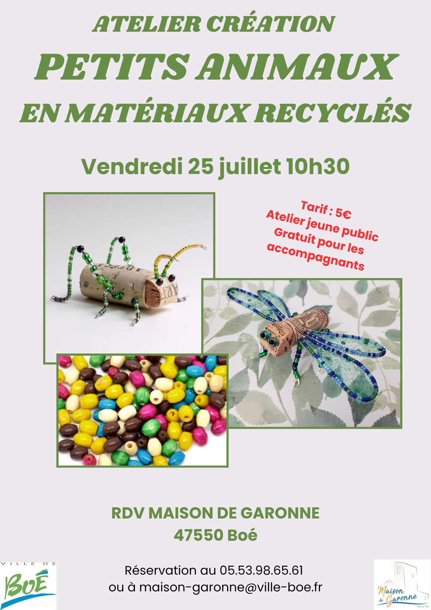 Atelier manuel où les enfants pourront réaliser des petits animaux de la nature avec des bouchons, fils et perles.