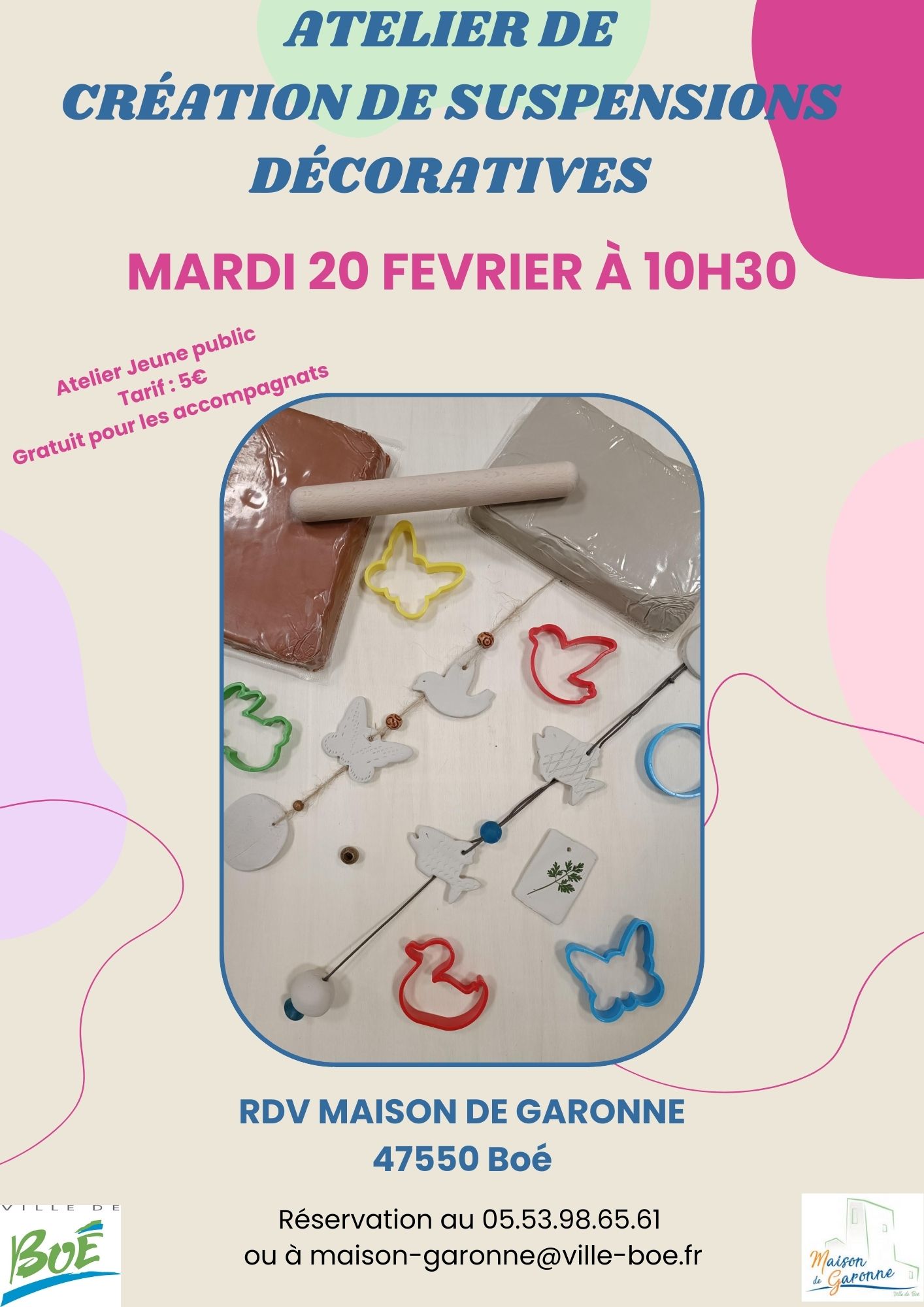 Atelier manuel où les participants pourront s’initier au modelage et à l’argile.Ils créeront leur céramique à suspendre par façonnage et à l’aide d’emporte-pièces pour créer la forme souhaitée. Ils pourront ensuite y ajouter des motifs de leurs choix afin de personnaliser leur création.