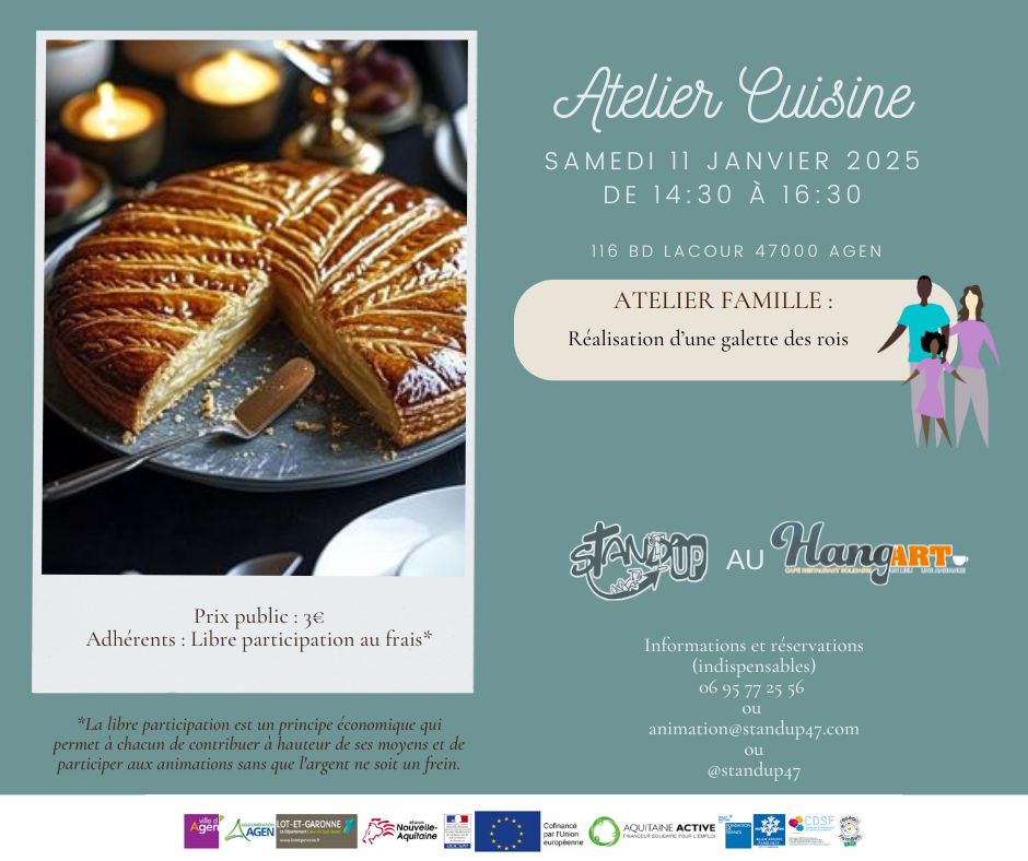 Loisirs Atelier Cuisine Le Hang'art - Agen 116 Boulevard Edouard Lacour 47000 Agen Voir tous les événements se déroulant ici le 11 janvier De 14h30 à 16h Familial 3€ Réalisation d’une galette des rois ! Stand'UP 06 95 77 25 56 animation@standup47.com