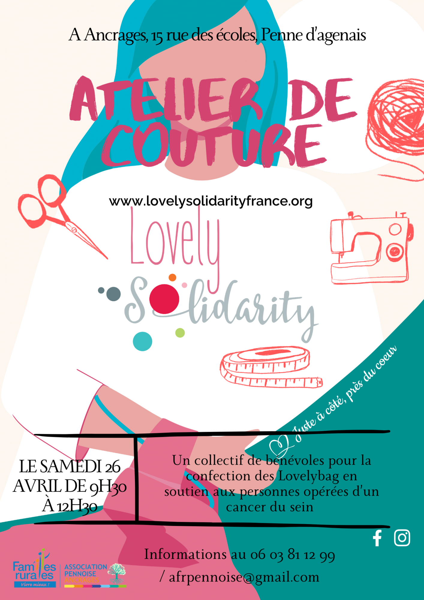 Sur la matinée du samedi 26 avril, on vous propose de venir, couper, coudre, aider, à la confection de sac qui seront distribués par Lovely Solidarity aux hôpitaux pour les personnes en soin pour le cancer du sein.