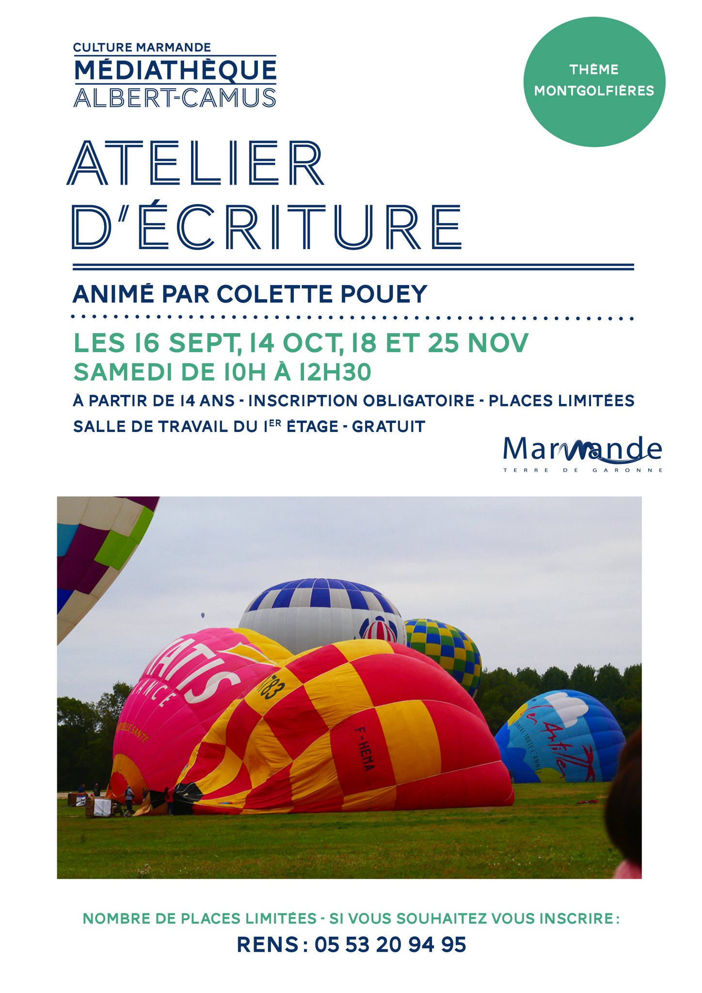 Atelier d’écriture animé par Colette Pouey, sur le thème des montgolfières.Prenez de la hauteur, laissez-vous porter par le vent ou secouer par les intempéries, séduire par le soleil levant et de somptueux paysages. Et racontez-nous tout !