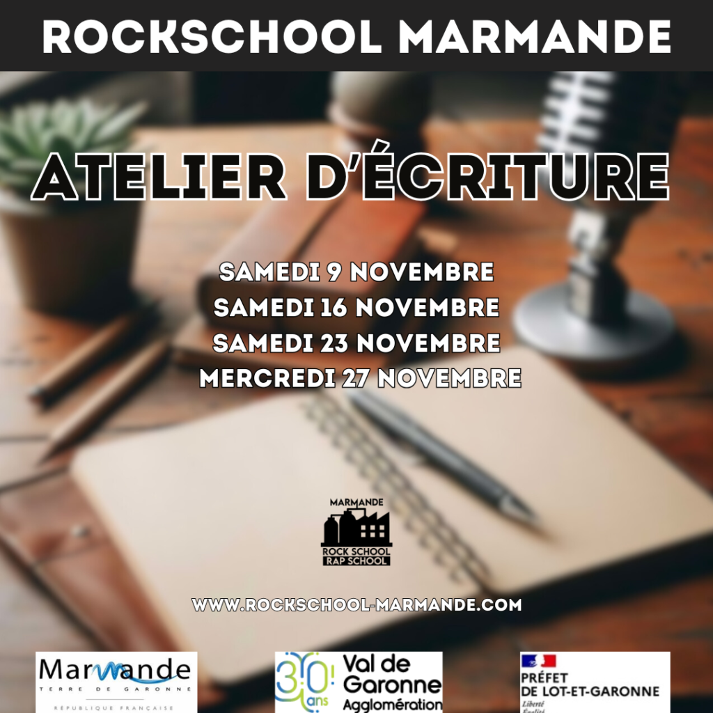 La Rockschool propose aux apprentis poètes et créateurs de textes, slams, rap, chanson… des ateliers d’écriture en vue de la 3ème édition de Marche ou Rêve, qui aura lieu au Plaza le 29 novembre. Ces textes pourront y être affichés, déclamés ou rappés lors du cypher qui aura lieu ce jour-là.