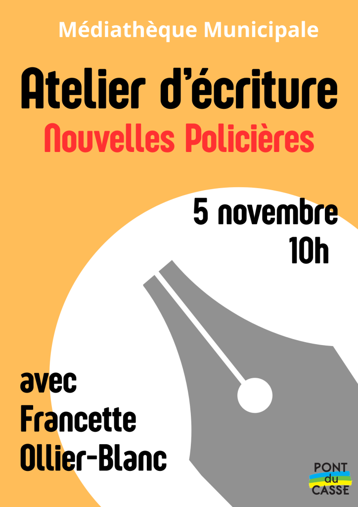 Le 5 novembre, nous aurons le plaisir d’accueillir Francette Ollier-Blanc, écrivaine, pour animer un atelier d’écriture de nouvelles policières.