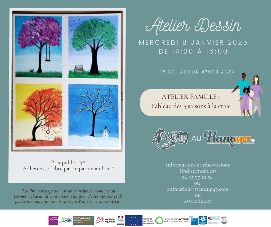 Loisirs Atelier dessin Le Hang'art - Agen 116 Boulevard Edouard Lacour 47000 Agen Voir tous les événements se déroulant ici le 8 janvier 2025 De 14h30 à 16h Familial 3€ Création d’un tableau des 4 saisons à la craie ! Stand'UP 06 95 77 25 56 animation@standup47.com