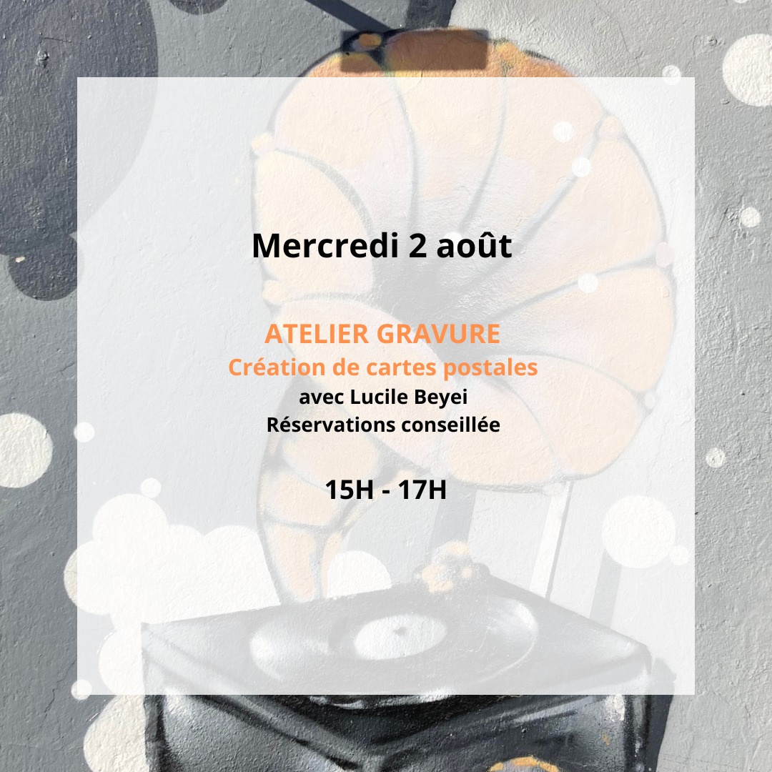 Mercredi 2 août le Café 109 vous propose avec l’artiste Lucile Beyei un atelier de création de cartes postales via la pratique artistique de la gravure !