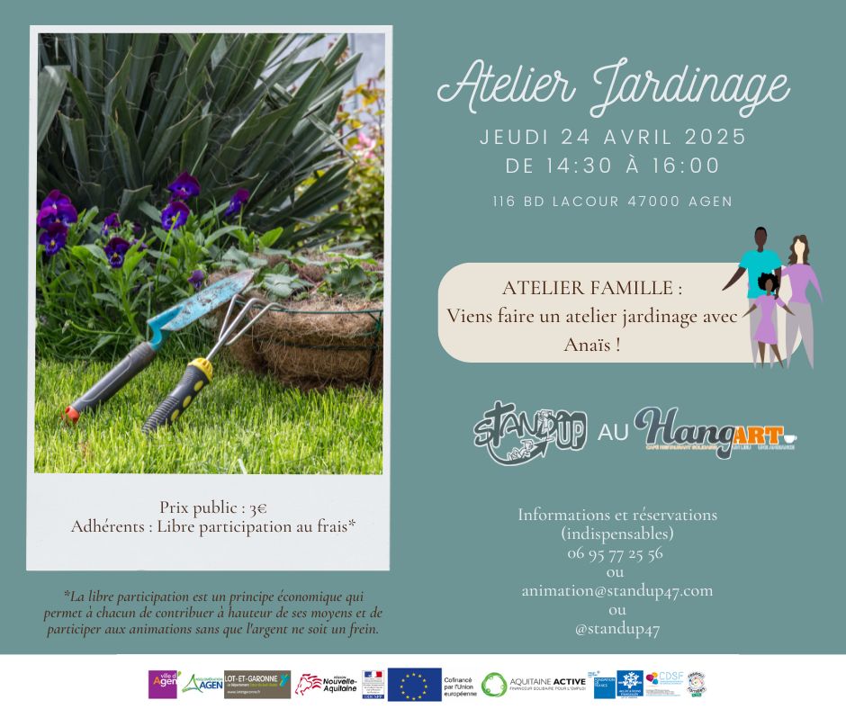 Loisirs Atelier Jardinage Le Hang'art - Agen 116 Boulevard Edouard Lacour 47000 Agen Voir tous les événements se déroulant ici le 24 avril De 14h30 à 16h 3€ Venez jardiner avec Anaïs pour préparer des herbes aromatiques. Stand'UP 06 95 77 25 56 animation@standup47.com