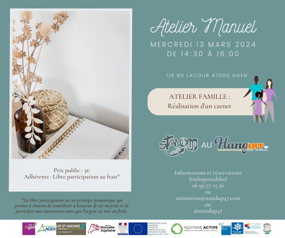 Loisirs Atelier manuel Atelier Loisirs Créatifs en famille Le Hang'art - Agen 116 Boulevard Edouard Lacour Agen Voir tous les événements se déroulant ici le 13 mars 2024 De 14h30 à 16h Familial 3€ Réalisation d’un carnet. Stand'UP 06 95 77 25 56 animation@standup47.com