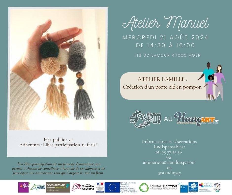 Loisirs Atelier manuel Le Hang'art - Agen 116 Boulevard Edouard Lacour 47000 Agen Voir tous les événements se déroulant ici le 21 août 2024 De 14h30 à 16h Familial 3€ Création d’un porte clé en pompon. Venez nombreux ! Stand'UP 06 95 77 25 56 animation@standup47.com