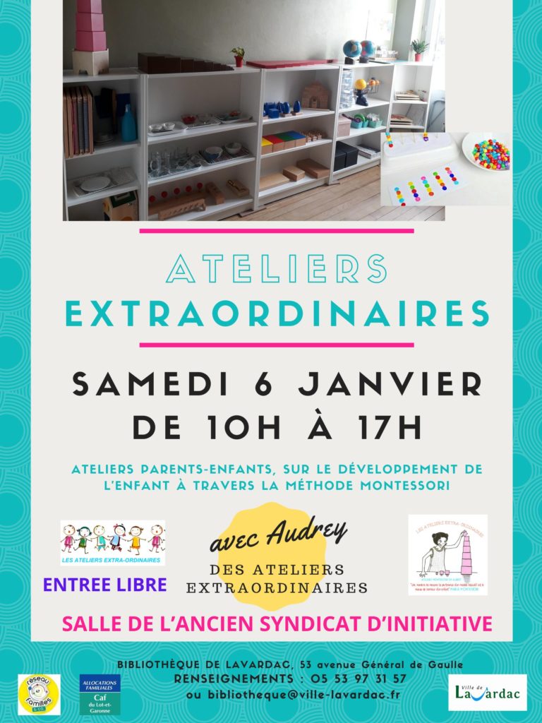 Avec le soutien de la CAF de Lot et Garonne, dans le cadre du réseau Parents 47 & Co, la bibliothèque de Lavardac et les Ateliers Extraordinaires organisent des ateliers gratuits parents-enfants sur le développement de l’enfant à travers la méthode Montessori.Audrey vous attend le samedi 6 janvier de 10h à 17h.