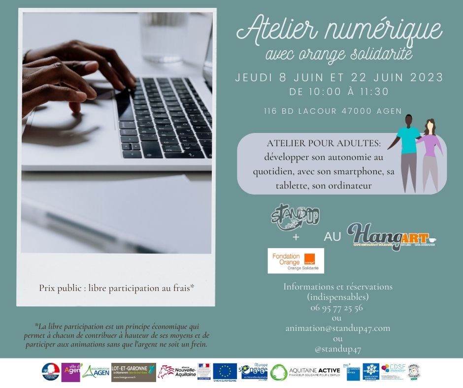 Loisirs Atelier Numérique Le Hang'art - Agen 116 Boulevard Edouard Lacour Agen Voir tous les événements se déroulant ici le 8 juin 2023 De 10h à 11h30 Libre participation Venez pour mieux comprendre vos appareils numériques ! Stand'UP 06 95 77 25 56 animation@standup47.com