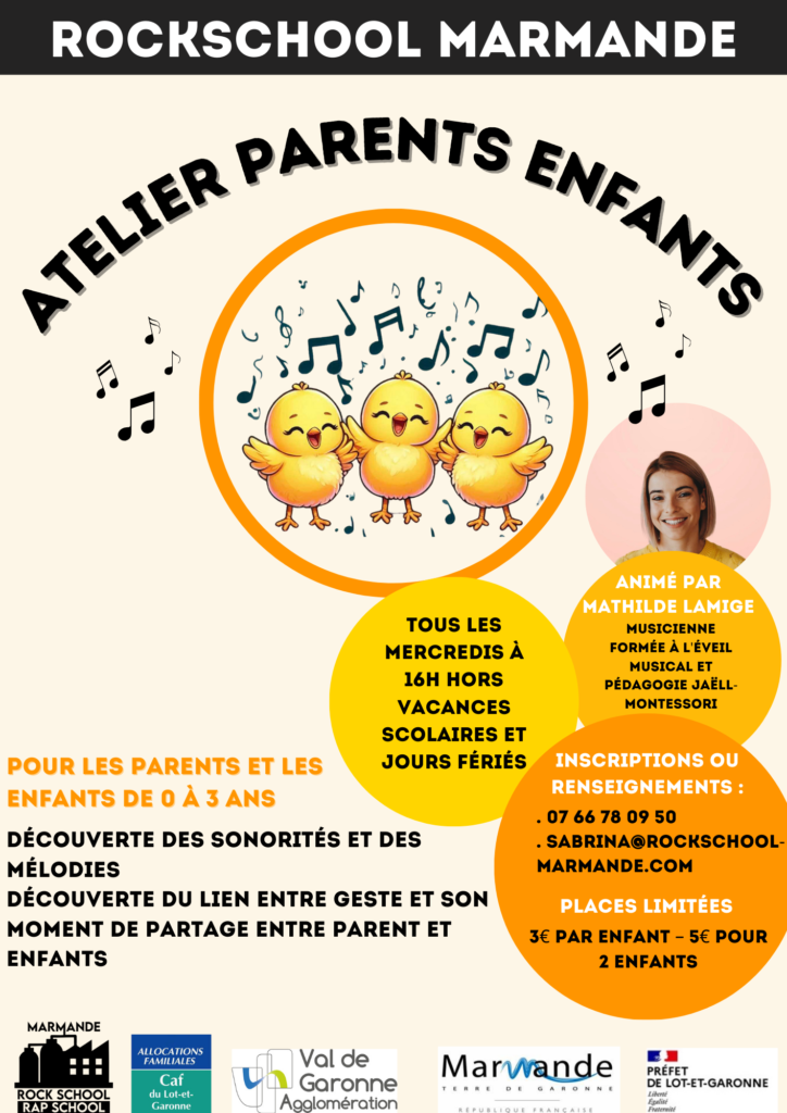 La Rockschool organise jusqu’au mercredi 16 avril des ateliers parent-enfant autours de la musique. Ces ateliers destinés aux 0-3 ans accompagnés de leurs parents ont lieu tous les mercredis à 16h hors vacances scolaires et sont animés par Mathilde Lamige.
