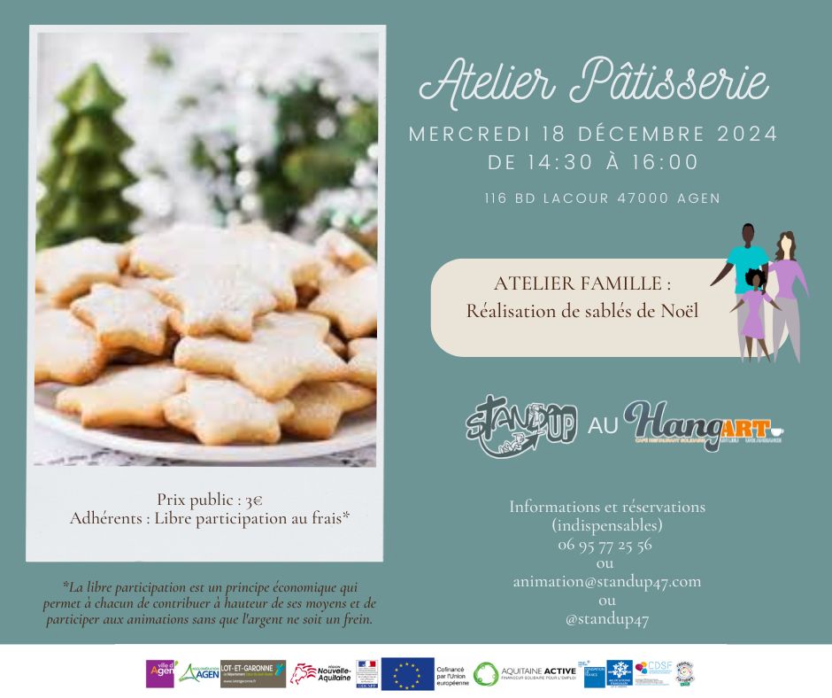 Loisirs Atelier Pâtisserie Le Hang'art - Agen 116 Boulevard Edouard Lacour 47000 Agen Voir tous les événements se déroulant ici le 18 décembre 2024 De 14h30 à 16h Familial 3€ Réalisation de sablés de Noël. Stand'UP 06 95 77 25 56 animation@standup47.com