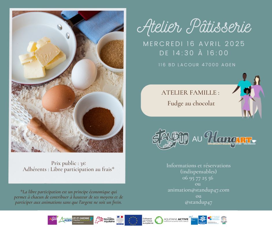 Loisirs Atelier pâtisserie Le Hang'art - Agen 116 Boulevard Edouard Lacour 47000 Agen Voir tous les événements se déroulant ici le 16 avril De 14h30 à 16h Familial 3€ Venez réaliser un fudge au chocolat avec Anaïs. Stand'UP 06 95 77 25 56 animation@standup47.com