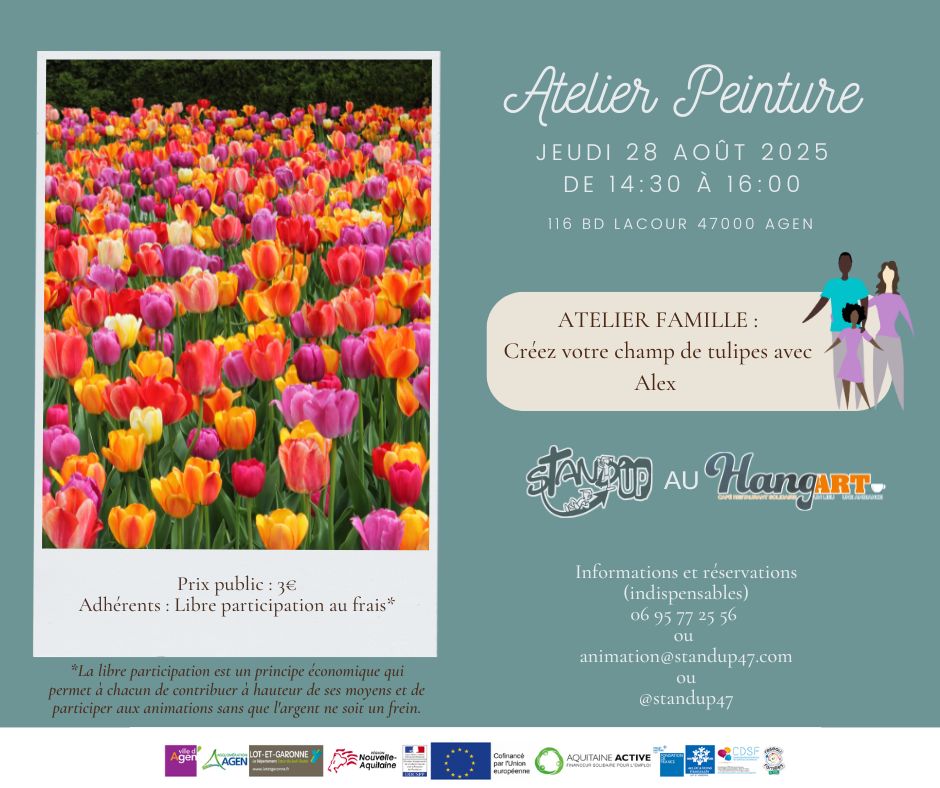 Loisirs Atelier peinture Le Hang'art - Agen 116 Boulevard Edouard Lacour 47000 Agen Voir tous les événements se déroulant ici le 28 août De 14h30 à 16h Familial 3€ Venez créer votre propre champ de tulipes avec Alex ! Stand'UP 06 95 77 25 56 animation@standup47.com
