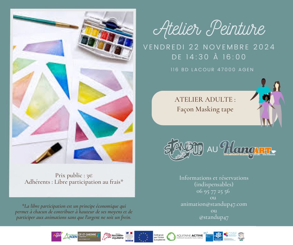 Loisirs Atelier peinture Le Hang'art - Agen 116 Boulevard Edouard Lacour 47000 Agen Voir tous les événements se déroulant ici le 22 novembre 2024 De 14h30 à 16h 3€ Atelier peinture façon masking tape. Stand'UP 06 95 77 25 56 animation@standup47.com