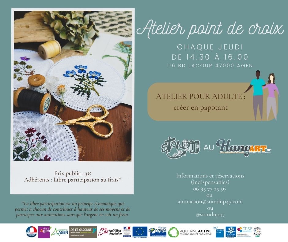Loisirs Atelier Point de Croix Atelier Loisirs Créatifs Le Hang'art - Agen 116 Boulevard Edouard Lacour Agen Voir tous les événements se déroulant ici le 29 juin 2023 De 14h30 à 16h 3€ Venez créer tout en papotant ! Stand'UP 06 95 77 25 56 animation@standup47.com