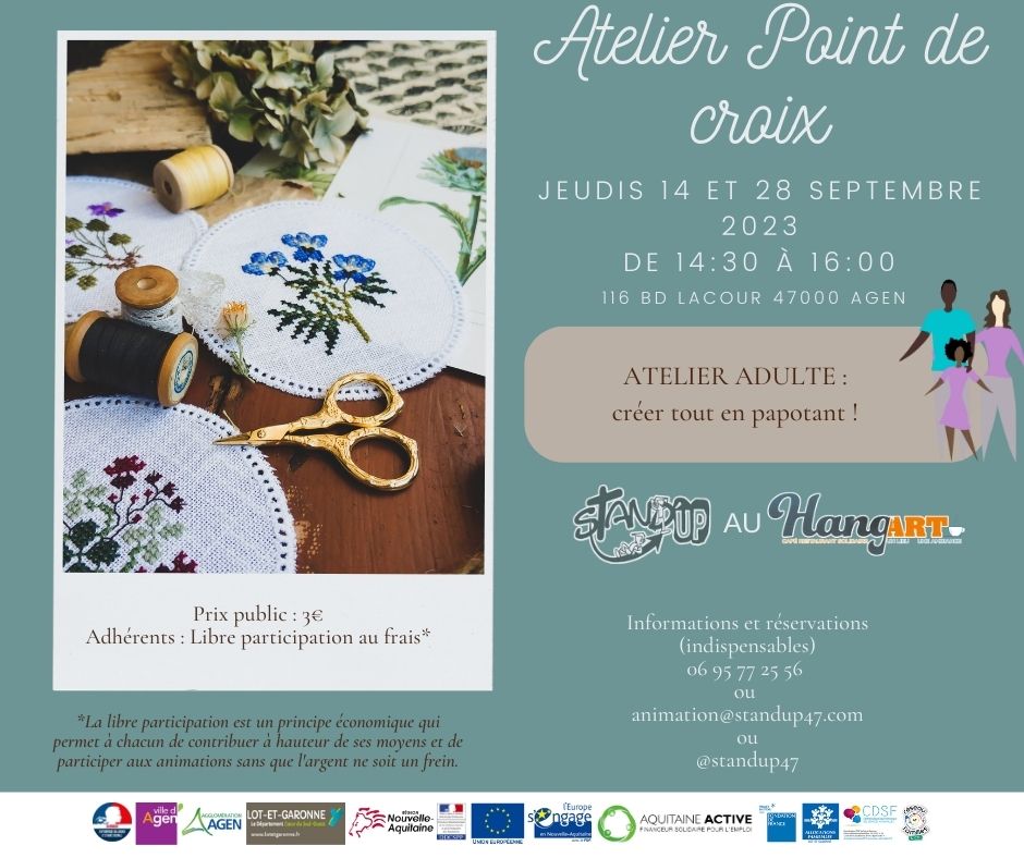 Loisirs Atelier Point de croix Le Hang'art - Agen 116 Boulevard Edouard Lacour Agen Voir tous les événements se déroulant ici le 14 septembre 2023 De 14h30 à 16h Familial 3€ Venez créer tout en papotant ! Stand'UP 06 95 77 25 56 animation@standup47.com