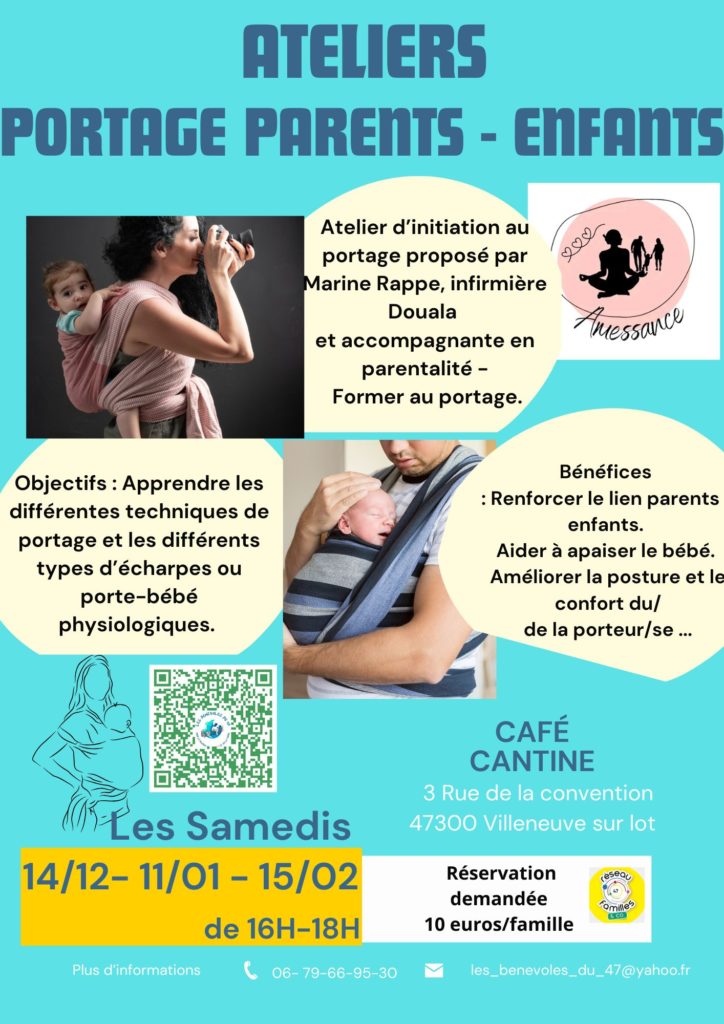Ces ateliers sont l’occasion idéale ! Avec Marine Rappe infirmière et formée spécifiquement au portage. Elle vous partage expérience et techniques.