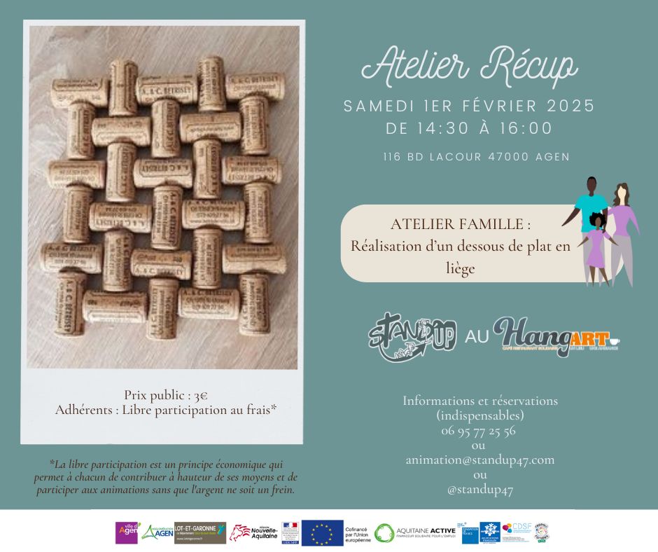 Loisirs Atelier Récup Le Hang'art - Agen 116 Boulevard Edouard Lacour 47000 Agen Voir tous les événements se déroulant ici le 1 février De 14h30 à 16h Familial 3€ Réalisation d’un dessous de plat en bouchon en liège. Stand'UP 06 95 77 25 56 animation@standup47.com