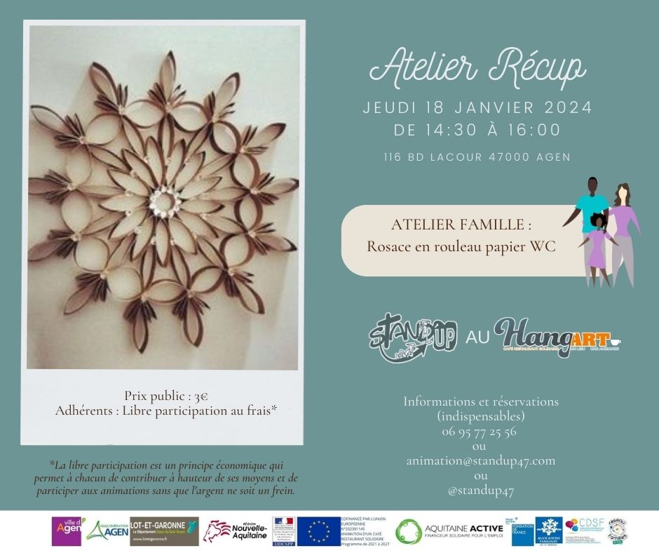 Loisirs Atelier récup Atelier Loisirs Créatifs Le Hang'art - Agen 116 Boulevard Edouard Lacour Agen Voir tous les événements se déroulant ici le 18 janvier 2024 De 14h30 à 16h Familial 3€ Réalisation de rosace en rouleau. Stand'UP 06 95 77 25 56 animation@standup47.com