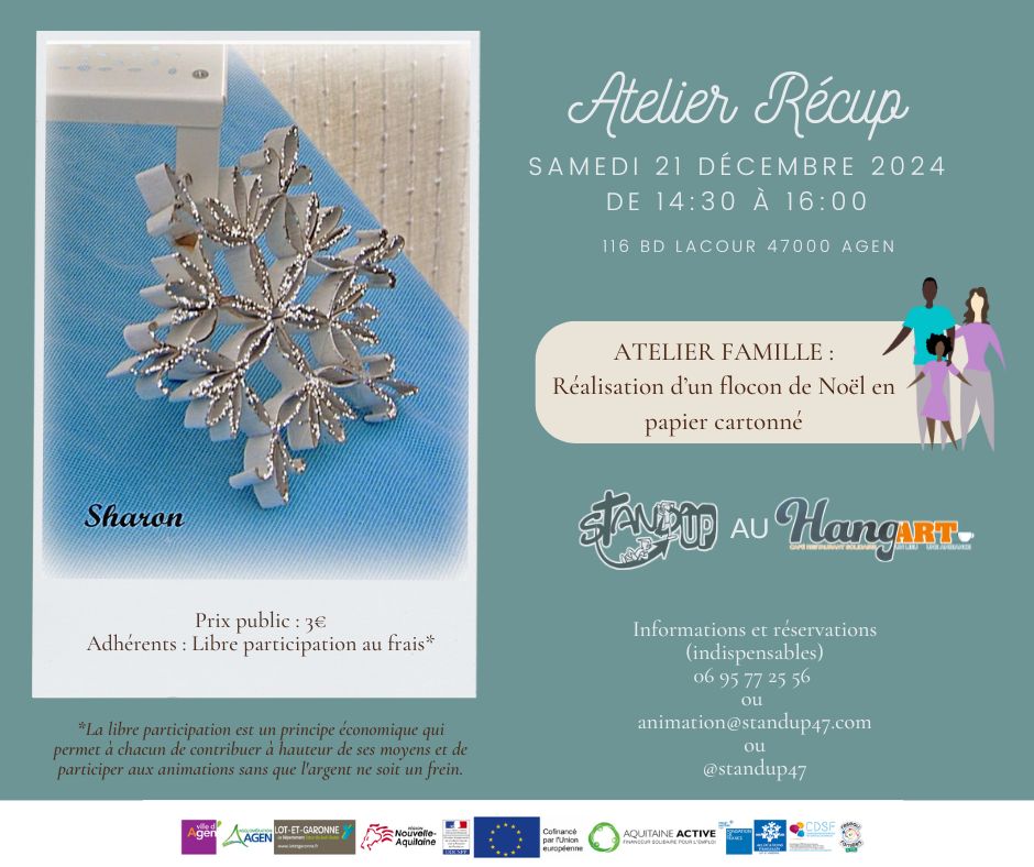 Loisirs Atelier Récup Le Hang'art - Agen 116 Boulevard Edouard Lacour 47000 Agen Voir tous les événements se déroulant ici le 21 décembre 2024 De 14h30 à 16h Familial 3€ Réalisation de flocons de Noël en papier cartonné. Stand'UP 06 95 77 25 56 animation@standup47.com