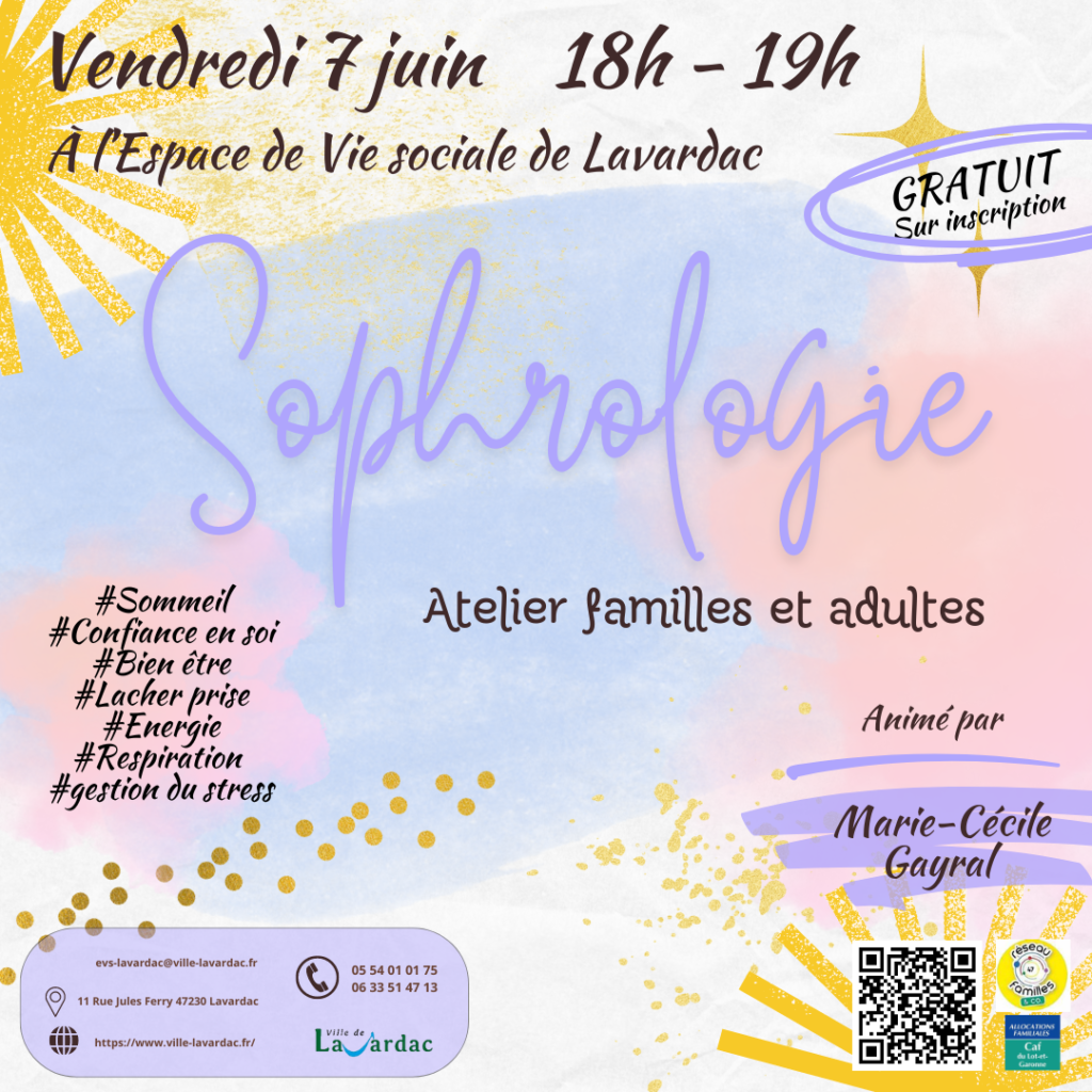 De 18h à 19h aura lieu un Atelier Sophrologie à l’Espace de Vie Sociale de Lavardac.
