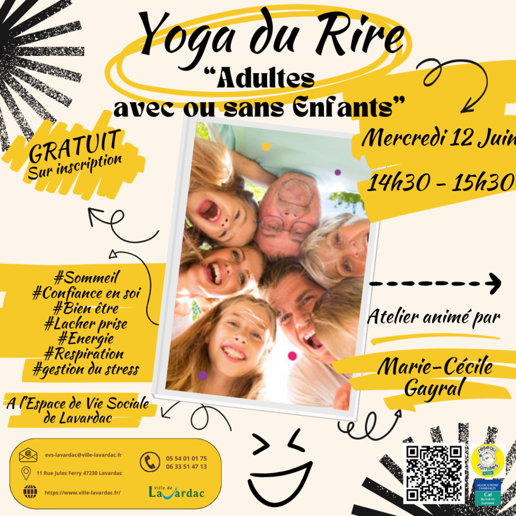 De 14h30 à 16h aura lieu un Atelier Yoga du Rire à l’Espace de Vie Sociale de Lavardac. Cet Atelier est ouvert à tous, en famille (parents -grands parents …- enfants dès 5 ans), adulte seul.