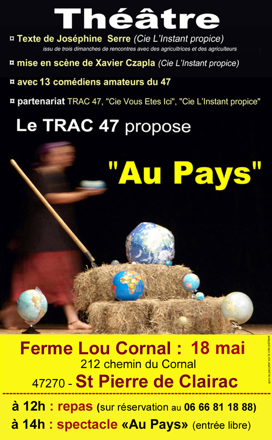 Nous sommes ravis d’accueillir sur la ferme LE TRAC 47 pour sa représentation de la pièce de théâtre « AU PAYS »!